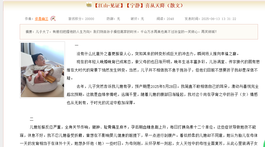 NO.14 依是幽兰 【江山·见证】【宁静】喜从天降(散文)_江山文学网 https://www.vsread.com/article-1022403.html