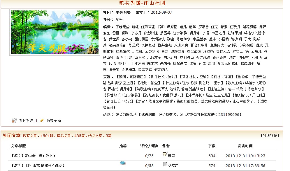 2013即将成为过往,2014年来了,在这辞旧迎新之际,笔尖社团文友在一起拼搏尽管只有120多天,但我们彼此留下了很深的印象。在此,说什么都是多余的,我们一起感谢2013,感谢江山文学网领导,感谢江山文朋诗友,感谢社团全体文友……