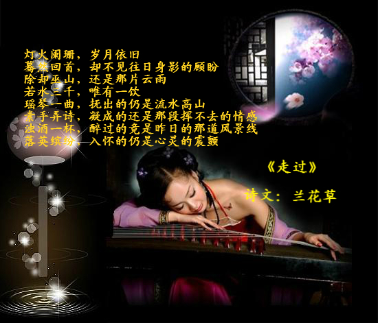 【荷塘絮语】走过(原创首发)2014-04-07 22:17:48走过万水,走过千山—— 走过烟雨蒙蒙的江南, 走过晓风残月的杨柳岸, 走过五千年的路途漫漫…… 走过武帝藏娇的进屋, 走过文君当垆的酒肆; 走过大唐飞歌的情缘, 走过秦淮女子的香艳。 走过,走过, 走过了千万里, 走过了岁月沧桑的轮回, 依然走不出我自己的…… 沧海桑田,改变不了情思片片; 大江东去,淘不尽往日情感; 灯火阑珊,岁月依旧, 蓦然回首,却不见往日身影的顾盼; 除却巫山,还是那片云雨, 弱水三千,唯有一饮。 瑶琴一曲,抚出的仍是流水高山; 素手调香,凝成的还是那段情感; 浊酒一杯,醉过的竟是昨日的风景线; 落英缤纷,入怀的仍是心灵的震颤…… 走过万水,走过千山, 却依然走不出 自己的心田……