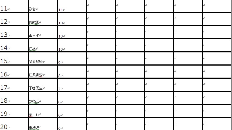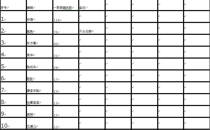 为统计编辑的劳动量,对江山文学网分配干股(目前筹划之中)进行合理再分配,体现多贡献者多得的原则。同时,也是社团优秀编辑的重要参考。笔尖社团一季度编辑数量进行了统计,截止时间为4月11日上午10时,请各人核对,发现统计有误的请于4月11日晚11时前在本人QQ小窗留言或者跟帖,感谢大家理解支持! 现公示如下: 笔尖社团编辑数量统计公示4.11