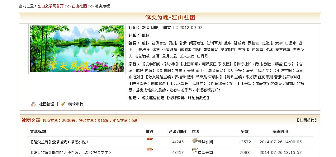 初到笔尖,一片荒凉,文友只有几个,几乎停止了发文。百废待兴,我们在航社的带领下,招兵买马,艰苦奋战。没过多久,社团就起死回生了。在这段时间里,航社给了我许多鼓励,让我多写小说。无尘老师在写作方法上给了我许多指导,让我茅塞顿开。娴雅老师对我更是关怀备至,每次发文都会跟帖点评鼓励。在这些文友老师的鼓励和帮助下,我很快就完成了五篇万字小说,成功签约了,成为江山的签约作者。这使我信心大增。我不断地写作读书,如痴如醉。此外,我积极地参与到编辑和互动点评中,短小的文字就发在社团论坛上。我在笔尖玩得真开心,收获着梦想和快乐。 一路走来,沧海桑田。笔尖社团在江山排名都是名列前茅,这离不开各位文友老师的支持和关爱。虽然由于种种客观原因,一些文友离开了笔尖,但是他们对笔尖所做的贡献和对我本人的关爱和帮助,我永远铭记在心。去留随意,往来如风。我知道你们不曾走远,一直默默地关注着笔尖,笔尖因你们而骄傲。