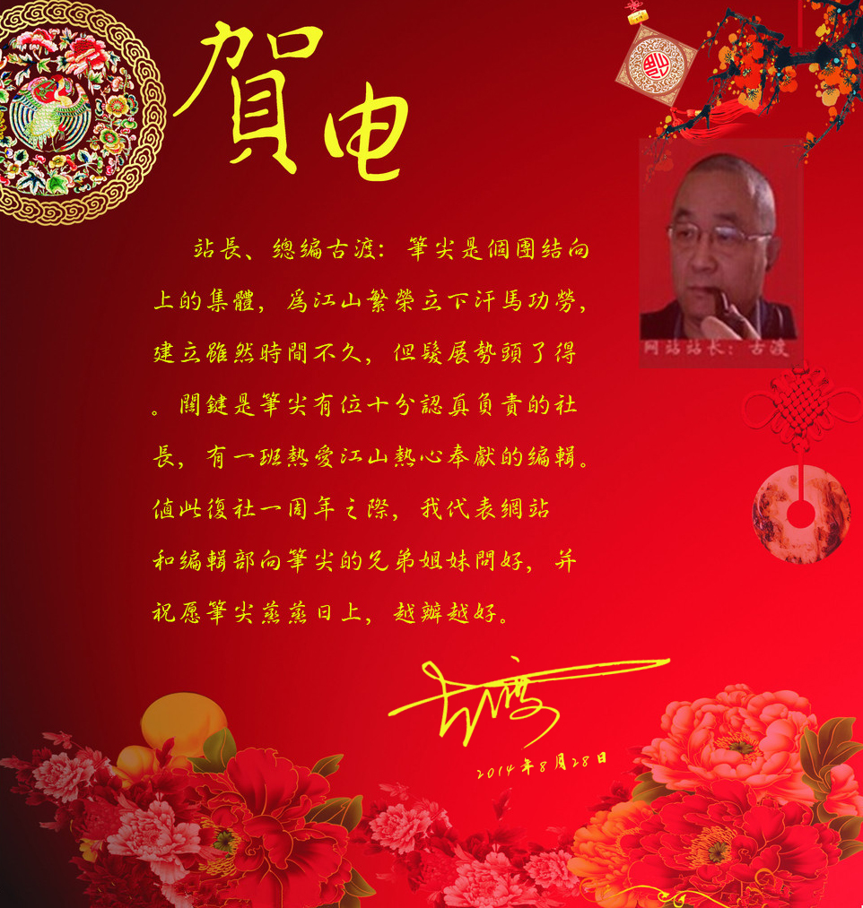 站长、总编古渡:笔尖是个团结向上的集体,为江山繁荣立下汗马功劳,建立虽然时间不久,但发展势头了得。关键是笔尖有位十分认真负责的社长,有一班热爱江山热心奉献的编辑。值此复社一周年之际,我代表网站和编辑部向笔尖的兄弟姐妹问好,并祝愿笔尖蒸蒸日上,越办越好。