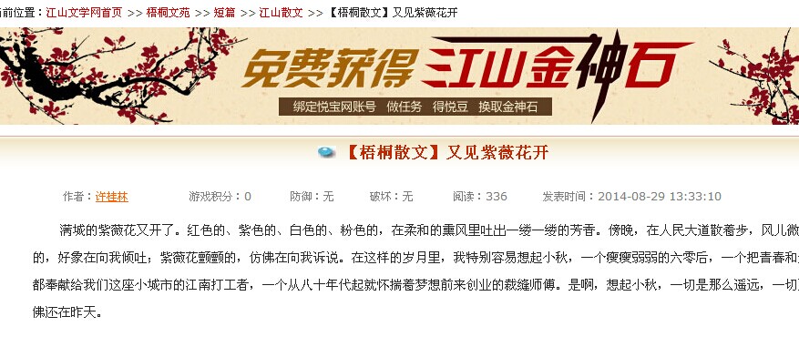 江山ID:墨染倾城 姓名 孙梅文集地址链接: http://www.vsread.com/space/myspace-45401.html 在由安微省宿州市作家协会和安徽粤航装饰工程有限公司联合举办的首届“粤航装饰杯”小说散文大赛征文活动中,我们社团有几位作者本着对家乡的热爱和讴歌当今社会的美好善良、大力宣传正能量的精神,积极参与征文活动并获得奖项。安徽省著名散文作家许桂林在这次活动中参赛的作品《又见紫薇花开》获得散文类一等奖。另一个著名散文家孙梅的作品《故乡的思恋》获得散文类三等奖。让我们在这里祝贺他们!祝贺他们为自己的家乡、为自己热爱的那片土地唱出赞美的颂歌! 许桂林先生是中国作家协会会员;上海市作家协会会员;安徽省散文家协会理事;宿州市作家协会名誉主席。他在安徽宿州?桥区宣传部工作,兼职【新民晚报】记者。文章多见于国内各主要新闻、报刊、杂志。 在他参赛的散文作品《又见紫薇花开》中,描写了一位身患重病,乐观面对生活的小人物,也是小城的裁缝小秋。小秋和作者情同兄弟般的情谊,小秋虽身患重病但仍然不顾劳累挣钱养家的责任感、还有小秋对待小城民众的诚挚厚道,都在作者的笔下表现得淋漓尽致。 “小秋为人忠厚、善良,为城里的的男女老少做衣服真的是一丝不苟。从式样到裁剪,从缝纫到锁眼,一直到悬挂折叠,无一不精益求精。他说,做衣服面料固然重要,但量体裁衣,做工精细才是最关键的。八十年代人们穿衣服不象今天直接从商店购买成品,而是选一个好的服装店定做。好多年了,小秋的服装店总是门庭若市,从某种意义上说,他做的服装引领了小城服装市场的潮流。他的手艺和为人使他每到一处都会有一大批忠实的老顾客。提起裁缝师傅小秋,请他做衣服的人没有不夸他的。“投桃报李”是小城里人们的美德。所以每到逢年过节,小秋的老顾客和左邻右舍都会给他送一些过年的食品。小秋说,在这里心情舒畅,这里的人好啊。他是怀着感恩的心在我们这座小城里生活的。”作者笔下的小秋,仿佛就在眼前,一个外来打工者在当时那个年代,用自己的淳朴换来了人们的友情和支持。小秋的人格魅力被作者在文中升华了。这就是一篇好的散文给人们的启示,不但感动读者,也能让读者引起共鸣。