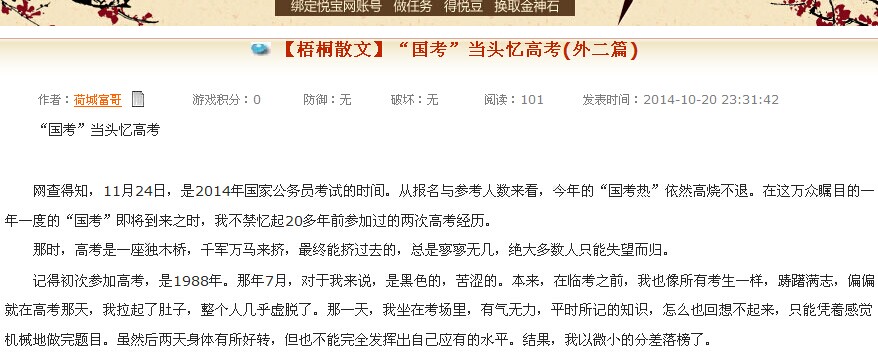 【梧桐喜讯】梧桐文友荷城富哥作品刊于玉林电视报2014-10-24 12:45:10真实姓名:韦以富,江山ID:荷城富哥,梧桐评论部部长,一个扎根于基层的公务员,文学爱好者,拥有一颗关爱民众、关爱弱势群体的平凡之心。他利用工作之便,行走于百姓之间;他凭自己的一双智慧眼,洞察社会底层;他用自己手中的犀利之笔,反应平凡人的心声;他以热情而又真挚的情感去关爱平凡人的生活。一个利用文字和爱心去挑大山的男人。 2014年10月24日 荷城富哥作品《“国考”当头忆高考》刊于玉林电视报,社会周刊 江山ID:荷城富哥 江山文集地址链接:http://www.vsread.com/space/myspace-45366.htm