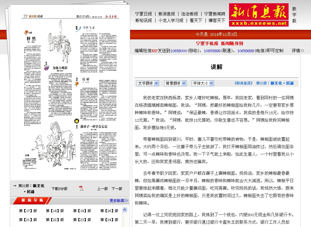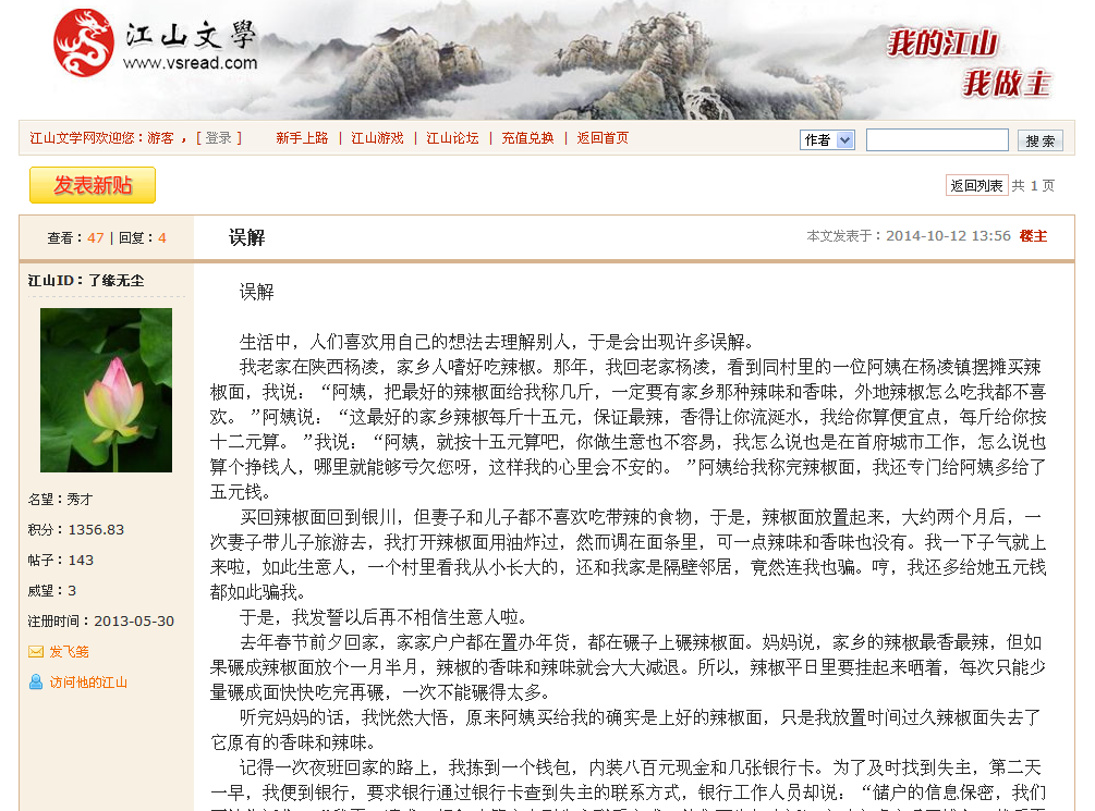 笔尖社团总编了缘无尘随笔作品《误解》发表于11月3日《新消息报》,该文10月12日首发于江山文学网笔尖论坛。 了缘无尘,生于1969年10月。祖祖辈辈生活在陕西杨陵杨坚陵下东北三公理处。1987年离开家乡参军到武警部队。1990年到武警部队呼和浩特指挥学校上学后提干,2002年提升到营级干部时转业到银川一家报社工作。曾在部队编撰过三十万字的武警某支队志。先后做过宣传、秘书、记者、编辑、校对等工作。在报纸上写新闻报道及发表散文随笔约有一百万字。