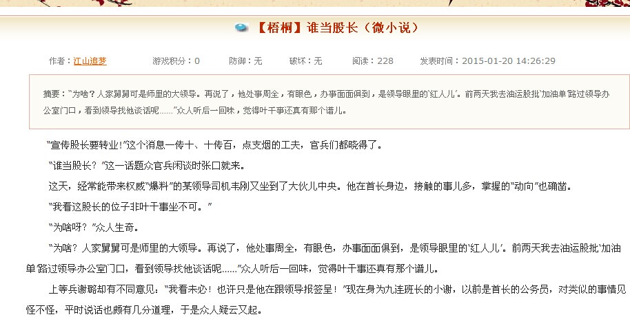 江山文集地址链接:http://www.vsread.com/space/myspace-50046.html 作者部分作品展示: 文章地址链接:http://www.vsread.com/article-513495.html 【梧桐】谁当股长(微小说)![]()