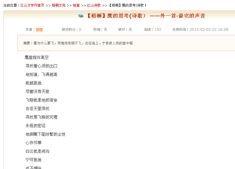 【梧桐】热烈欢迎知名作家棱镜进驻梧桐2015-03-04 18:57:29江山ID:棱镜,本名:许晓铨。 自述:自小在市委大院长大,住机关,吃食堂。有点不食人间烟火样,接着受点牵连,一场误会囹圄十年,两根支柱支撑着迎来春天,平反后脊椎没弯,精神没垮,喜欢文字,天马行空,特立独行,没甚建树,权当乐趣。有人懂我,便感激涕零。但愿弦不断有人听。 ![]() 2015年3月4日,棱镜注册江山,在梧桐文苑发表第一篇作品《【梧桐】鹰的思考(诗歌) ——外一首·豪宅的声音》: