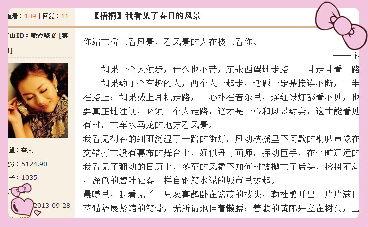 【梧桐】我看见了春日的风景文章发表地址链接http://www.vsread.com/bbs/topic-48120-449207.html你站在桥上看风景,看风景的人在楼上看你。 ——卞之琳《断章》 如果一个人独步,什么也不带,东张西望地走路——且走且看一路的风景。 如果约了个有趣的人,两个人一起走,话题一定是接连不断,一半的心在她身上,留一半的心在路上;如果戴上耳机走路,一心扑在音乐里,连红绿灯都看不见,也无暇顾及路边的风景。 要真正地注视,必须一个人走路,这才是一心和风景约会,这才能看见风景。 有时,在车水马龙的地方看风景。 我看见初春的细雨浇湿了一路的街灯,风动枝摇里不间歇的喇叭声像在练习走调的交响;电光灯影交错打在没有幕布的舞台上,好似丹青画师,挥动巨手,在空旷辽远的画布上着下了浓重的一笔。 我看见了翻动的日历上,冬至的风霜不知何时被抛在了后头,榕树不动声色地盘桓,如曲折的心事,深色的碧叶轻雾一样自钢筋水泥的城市里拔起。 晨曦里,我看见了一只灰喜鹊卧在繁茂的枝头,勒杜鹃开出一片片满目含嗔灼灼其华的浓青艳丽;花猫舒展紧缩的筋骨,无所谓地伸着懒腰;善歌的黄鹂呆立在树头,压低了缀满紫荆花的枝丫。 有时,在水乡泽国的江南看风景。 我看见了乌篷船主点着篙,撩开纷纷靡靡的雨雾,小船飘进深深的苇浪里;撑着油纸伞的姑娘在幽长的雨巷里彳亍,像镜中花水中月那样,行来又复归去。 有时,在响着驼铃的丝绸之路上看风景。 我看见了苍莽的戈壁滩绵延无垠,有神舟划破长空的火龙;有鹰隼在铅灰色天空下盘旋;沙地里的骆驼刺执拗地直直穿刺虚空,有驼铃声落在沙丘的脊背上。 有时,在牛羊成群的塞外看风景。 我看见了草地深处牧草萋萋的迤逦,彩练样的河浮在草的腹地九曲回环;日光怔怔地滴坠在河面更似融化的金;赶马人带着马群拖沓地渡河,溅出一路的碎银。 有时,在异国他乡看风景。 我看见了夜雾朦胧里,路灯把人行道上新栽的塔柏影子悠悠地投到深褐的石墙上,和梧桐婆娑的树影纠缠在一起,看起来好似罗密欧对茱莉亚对唱情歌的倩影。 我看见了扶着自行车把的老妪,头顶高高的果盘,正要献于神佛;层层堆叠出鲜明诱人的色泽,看不见那裹进纱笼里被宗教掩盖的面庞,但却留意到了自然虔诚而又明亮的眼的轮廓。 我看见了奈良古寺里的黑色鸟羽,沉潜肃穆得像焚烧后的乌木;不远处是一片隐约的白色雪峰,森林对所有秘密守口如瓶,只沉默地环抱着一切。有只群鹿,不声不响地出现在在公路另一端的林地里,远远地望过来。 我或许是个摄影培训班的小学生,既不懂理论也不会操作,但跟风景约会的时间长了,步履匆匆间万物尽映眼底,忽然大悟——真正看到这风景、看到这个世界的,难道是那手里的数码相机,而不是自己的眼睛和心灵吗?