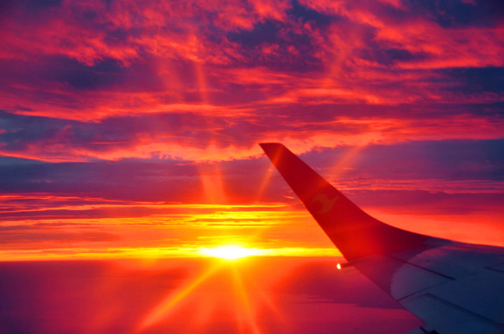 上了飞机找着座位巧的是刚好靠窗。机窗外太阳如同火球,红的耀眼,红的发烫,仿佛是炼钢工人刚出炉的液晶,如此美丽的晚霞使我难以忘怀。