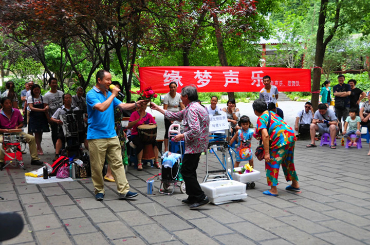 第二天,找家旅行社报了三个套餐:黄果树一天游的,赤水两天的,小七孔与西江苗寨两天的。还有闲工夫,下午来到黔灵山公园里面又大又热闹。湖里有捞水草的船工,不管天气炎热,一边劳作,一边欢歌。广场的树荫下团团围坐一群观众,正在听业余爱好者卡拉OK,边上摆放一块牌子:“坐小凳子捐一元”,生意还真不赖!