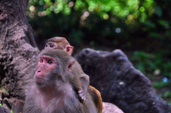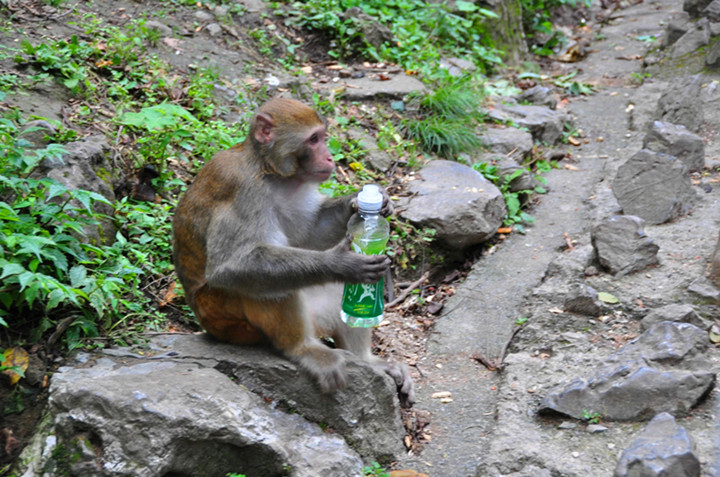 走着、走着,看见满山放养的猴子,不停地吃着游人投递的水果、花生,更奇怪的是会打开可乐瓶。
