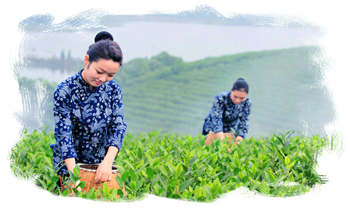 巧手辛劳采茶来,片片鲜叶入篓怀。