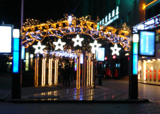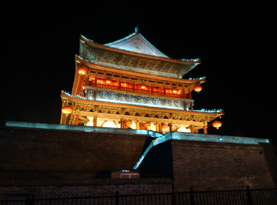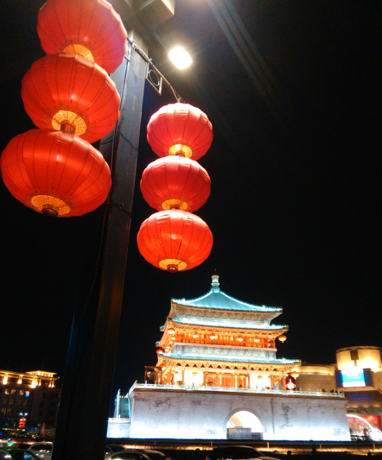 《夜景》 钟鼓楼前彩虹亮, 点缀古城换新装。 近观远眺夜色醉, 身在瑶池忘返乡。