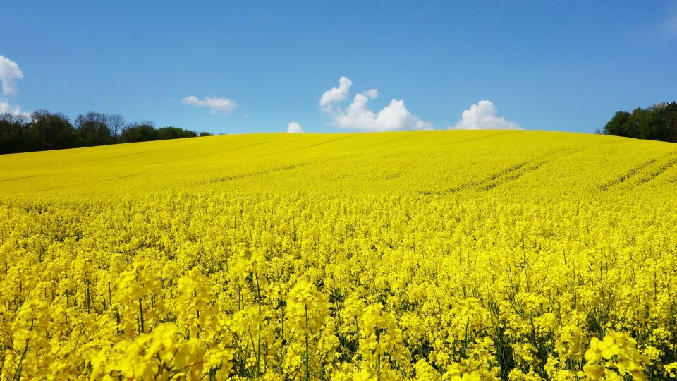 漫山遍野一大片连着一大片金黄出现在眼前时,我们停下车。我飞快跑过去,站在田头,任凭目光在层层金黄涟漪中翻飞。一阵风过,一朵朵簇拥在一起的油菜花,如含羞的少女浅浅微笑,似热恋的情侣窃窃私语惹人遐想。我突然有了欣赏它的冲动!