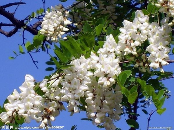 随着日子的翻过,榆钱儿慢慢变黄,变老,最后变干被风吹落。不过,在农村,你大可不必为榆钱儿的衰老而伤感,因为接着就是槐花登场的时候了,槐花最初是一串串的花骨朵。在微风的吹拂下轻摇曼舞。散发着阵阵清香。在绿叶的衬托下,绿白相间,像个调皮的姑娘。晶莹靓丽。槐花也可以生吃。味道清香甜润。每次忆起,在那贫脊的年代里,母亲和奶奶总是变着花样做给我们吃。拌面炒着吃,蒸过拌蒜泥吃等等!