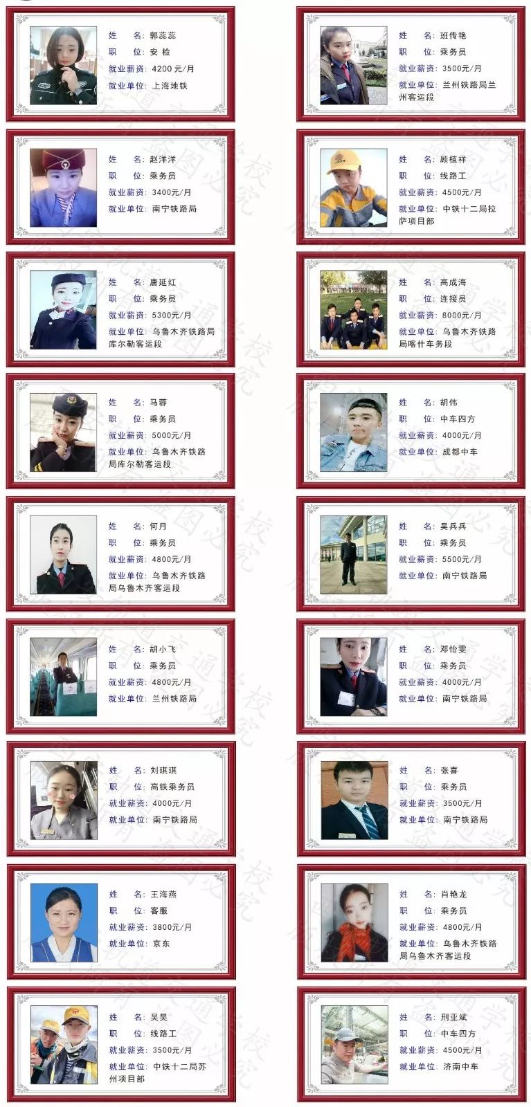 就业明星 就 业 保 障 ★全国各铁路局来我校选拔人才★ 【中铁三局来我校选拔人才】 【西安、兰州高铁来我校选拔人才】 【济青段领导来我校选拔人才】 【西安地铁4号线来我校选拔人才】 【西安高铁来我校选拔人才】 【兰州铁路局来我校选拔人才】 国民经济大动脉, 高薪就业新时代, 众里寻他千百度, 高薪就业不辜负, 培养铁道行业精英, 实现职业教育中国梦, 多年专注铁道教育, 风雨历程十多载, 西轨学子遍天下, 打造西北铁路教育黄埔军校。 报名流程 持本人身份证、户口本、毕业证、1寸彩色(蓝底)免冠照片8张,到学校或招生办事处填写报名表,经面试、复试、体检、政审合格后方可录取。 国家资助政策 国家助学金和免学费申请的条件: 1、国家免学费申请条件 全日制具有正式学籍的一、二、三年级的所有农村县镇以及城市家庭困难的在校生,按照国家政策要求申请评定。每年3600元。 2、国家助学金申请条件 全日制具有正式学籍的一、二年级所有农村县镇以及城市家庭困难的在校生,按照国家政策要求申请评定 。每年2000元。 招生条件 1、 五官端正,体型均匀,气质良好; 2、 身体健康,无任何传染性和心理疾病; 3、 无纹身,面部、颈部无明显伤疤; 4、 初中起点:男生身高167cm以上,女生身高157cm以上; 高中起点:男生身高170cm以上,女生身高160cm以上; 5、 双眼无色盲、无弱视等现象。 【人生选择永远大于努力】 长按识别二维码,人生不留遗憾 赵老师带你跨入铁路行业,圆你高铁梦! 实力院校 师资雄厚 规范办学 品质就业 |