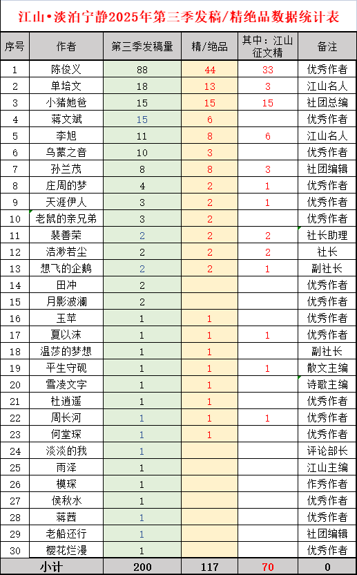 时序轮替,秋光正好。当夏的浓荫渐染金黄,秋的丰实便在岁月的笺页上落笔成章。2025年第三季度,淡泊宁静社团怀揣对文字的赤诚与热爱,在江山文学的沃土上深耕不辍,于墨香流转间收获了满径芳华。本季社团不仅稳居江山排名前八,延续"中游砥柱"的稳健风采,更在【见证】征文大赛中勇夺团体第四名,以笔为犁,以文为舟,在传承文化根脉、书写时代心声的航程中,镌刻下属于宁静人的璀璨印记。