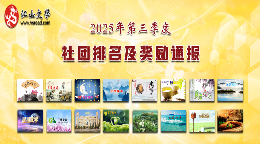 第三季度,江山48个社团共计编发短篇作品6001篇,其中精品2623篇,精品率为43.7%,绝品12篇。精品率比上季度的49.2%略有下降。江山版务部组织20个社团参与微信推广文60篇,31期主题摘句被列入“每周好句子”;江山记者部组织访谈4期;江山夜校组织1期绝品赏析活动;2025年度综合竞赛评比活动,继续顺利推进,有望竞争上榜的社团和作者将进入最后的冲刺阶段;【江山•见证】征文活动取得圆满成功,共征集各类体裁征文作品1883篇,其中精品1661篇;286名作者参与征文活动,其中,247名作者获精品,87名优秀作者获奖励;评审出62篇获奖作品,其中,特等奖1名,一等奖5名,二等奖10名,三等奖16名,优秀奖30名。征文活动有力促进了江山文学的创作活力!