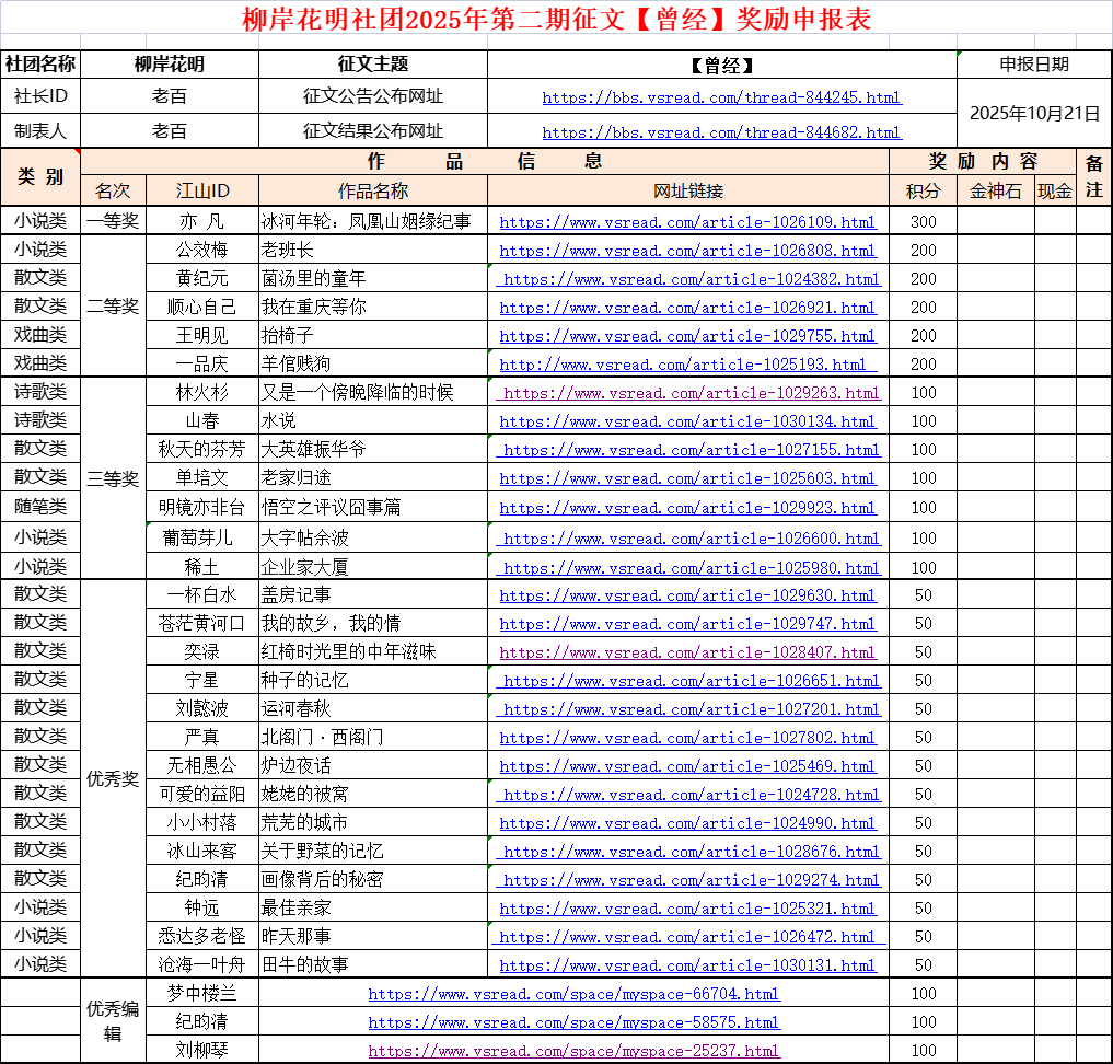 柳岸花明社团2025第二期主题征文【曾经】于2025年7月12日隆重开启,至2025年10月10日结束,历经91天时间,征文公告请见: 【柳岸】2025年第二期征文【曾经】盛大开启 柳岸花明 江山论坛 https://bbs.vsread.com/thread-844245.html 此次征文活动得到了江山系统领导的大力支持和广大文友的积极响应,江山新老文友们纷纷投稿支持,借此平台展示自我,推介作品,也锻炼自己的写作能力。在征文期间,柳岸社团共收到征文133篇,其中获得江山精品的有27位作者的74篇稿件。数据详见: 【柳岸花明】2025年第二期【曾经】征文获精入围作品 柳岸花明 江山论坛 https://bbs.vsread.com/thread-844410.html 经征文组委会认真评选,获奖作品如下: